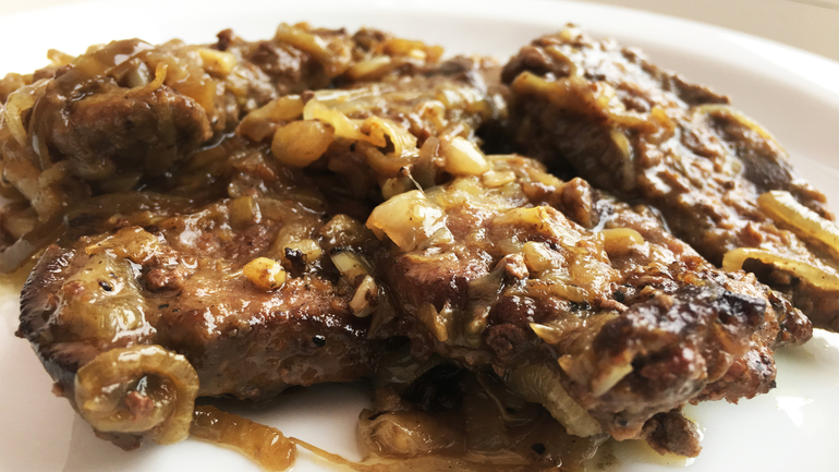 Лук порезать полукольцами и обжарить до золотистости. Печень свиную или говяжью зачистить от пленки и прожилок,нарезать ломтиками, как на отбивные толщиной 1-1,5 см., слегка отбить, обмакнуть в муку и обжарить на среднем огне по 1 мин., с каждой стороны. Переложить слоями печень с луком,добавить немножко воды, соль, перец и тушить под крышкой на среднем огне до готовности, около 5 мин.