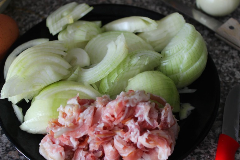 Нарезаем лук и бекон (можно без него)