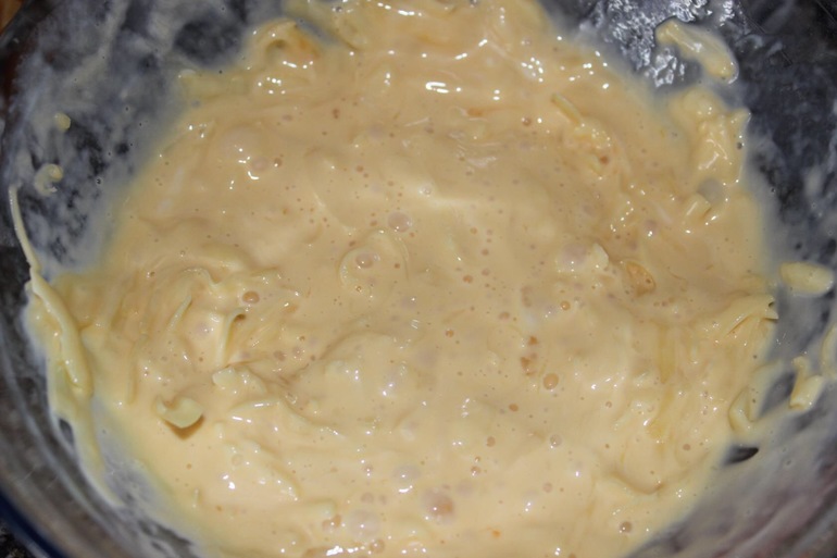 Делаем заливку: смешиваем сметану и яйца, солим и добавляем сыр