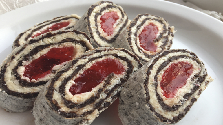 Теплым кремом смазать вафли, даем остыть, сверху накладываем кокосовый крем, полоску желе и скрутить рулет. Поставить в холодильник на 4 часа.