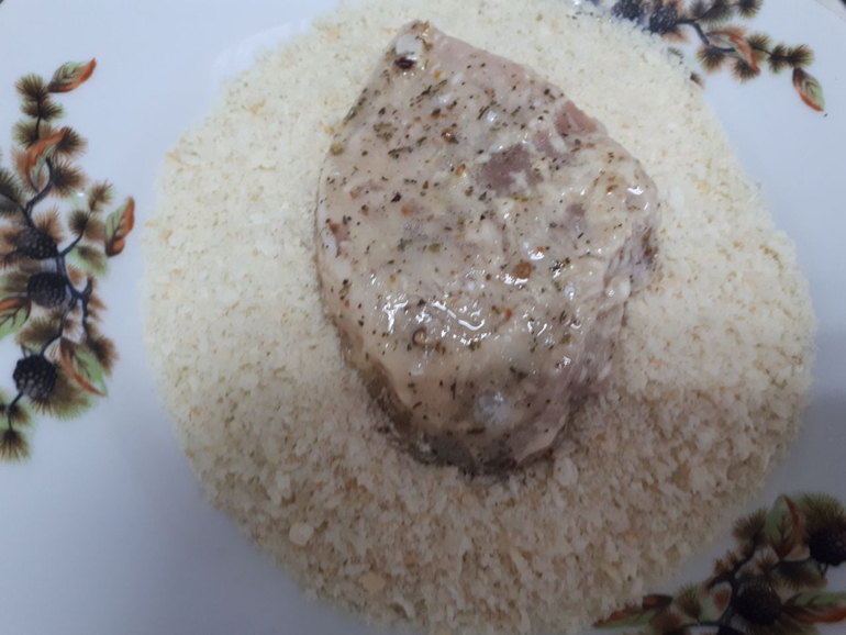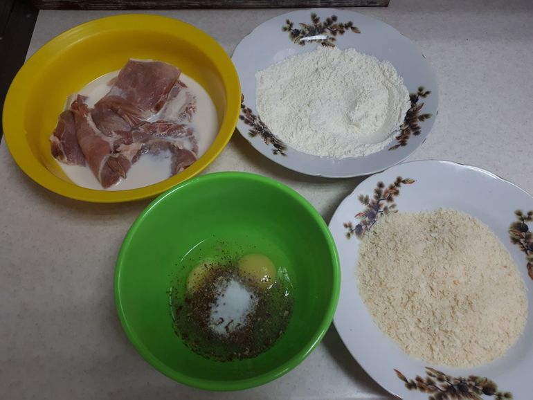 В одну тарелочку насыпаем муку, присаливаем ее. Во второй взбиваем яйца (у меня 2 на 8 кусочков свинины) с солью и специями. В третью насыпаем панировочные сухари.