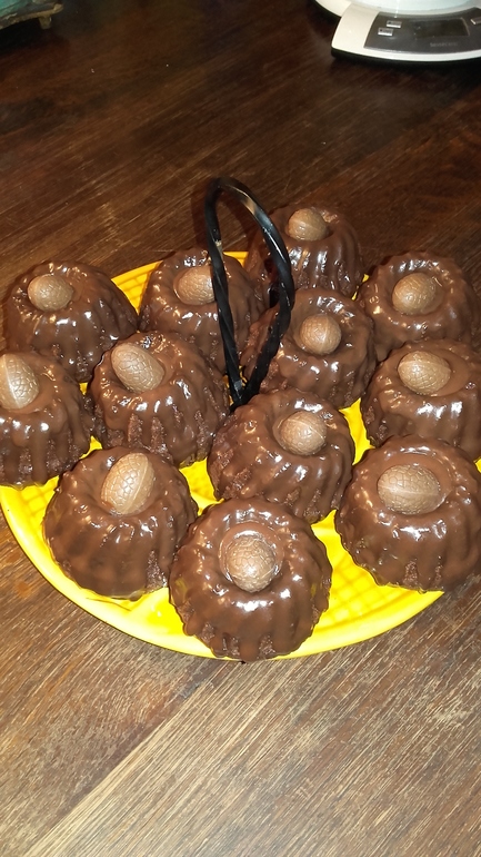 6. Положить кексы на решетку и полить ганашем. Обязательно наполнить дырочку-углубление в кексе: во-первых, за счет ганаша яйца не провалятся, а во-вторых, застывший ганаш - это так вкусно! Я поливала дважды. Украсить сверху шоколадными яйцами-конфетами и наслаждаться!