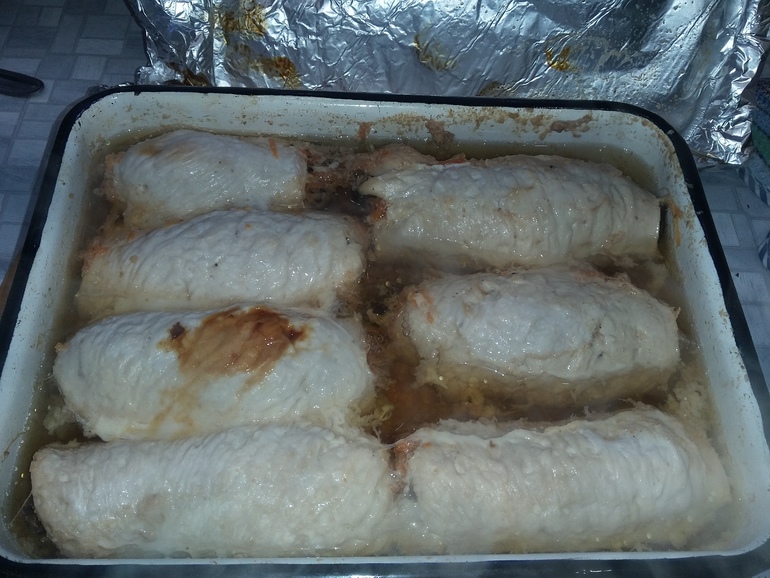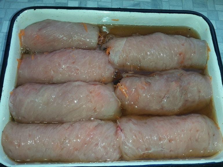 Теперь надо залить рулеты соком с мякотью. От вкуса сока зависит вкус всего блюда. Это может быть сливовый,гранатовый, апельсиновый, ананасовый сок. Я в этот раз использовала яблочный: