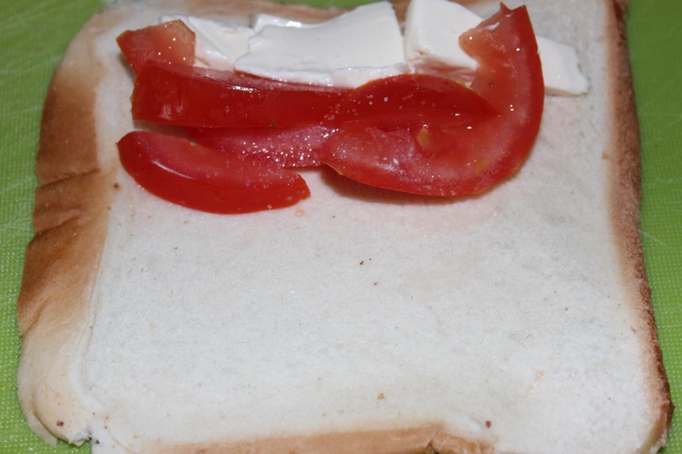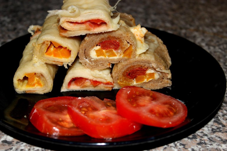 И выкладываем начинку: сыр, колбаса, овощи. Если кладёте помидор, то убирайте серединку, что бы не было сока и если готовите в микроволновой печи, лучше не использовать, будет более влажный.