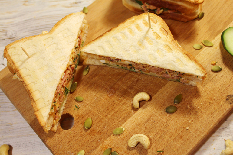 Клаб-сэндвич с тунцом. Вкусный бутерброд с тунцом, яйцом и орешками.