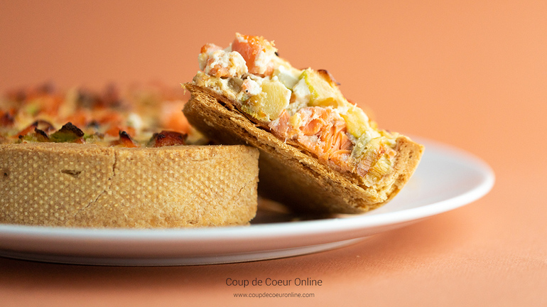 Лук порезать кольцами и обжарить на смеси сливочного и растительного масла до мягкости. Добавить цуккини, порезанные кубиками, и готовить вместе, пока цуккини не станут слегка мягкими, в самом конце добавить кубики красной рыбы и обжаривать еще 2-3 минуты все вместе. Посолить по вкусу. Выложить в песочную основу.