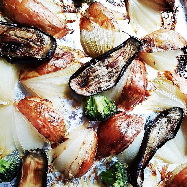 7-8 средних луковиц в шелухе порезать четвертинками, замариновать в миске с солью по вкусу, 1 ст.л.сахара и оливковым маслом (4-5 ст.л.), хорошо перемешать и оставить на 5 минут. Выложить на противень застеленный фольгой и выпекать в предварительно разогретой на 180-190С духовке 45-50 минут. Шелуху убрать, готовый лук хранить в контейнере в холодильнике макс.3 дня и пользоваться по мере надобности. В готовый лук также можно добавить пару капель бальзамического уксуса. (На фото баклажаны и брокколи добавила для красоты, их лучше печь отдельно)