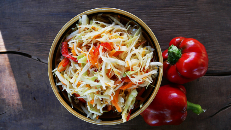 Капусту тонко нашинковать, морковь натереть на крупной терке, чеснок мелким кубиком, перец нарезать соломкой. Все тщательно перемешать и сложить в банки.