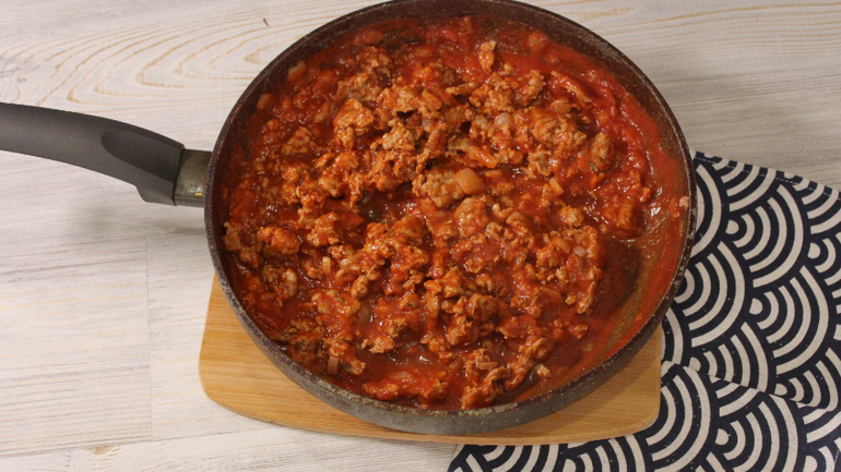 Порежем мелко лук и обжариваем его на растительном масле. Добавляем фарш, протертые помидоры, специи, соль. Обжариваем до готовности. Протертые помидоры можно заменить свежими либо томатной пастой.
