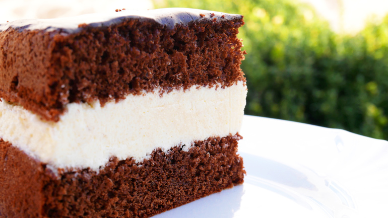 Разрезаем бисквит на две части. Можно пропитать сиропом. На нижнюю часть коржа выкладываем крем и накрываем верхней частью. Сверху поливаем шоколадной глазурью.