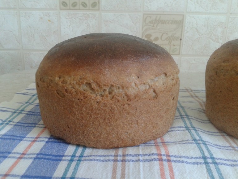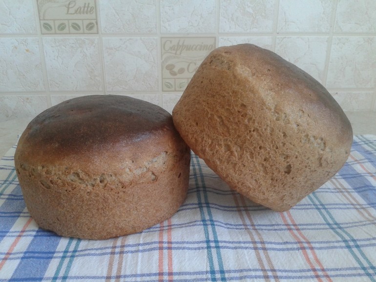 Смешайте все это и постепенно добавьте предварительно просеянную пшеничную муку.Замесите тесто. Когда оно будет готово, накройте миску с тестом пленкой или полотенцем и оставьте подходить на 1,5 часа. Когда время истечет,нужно обмять тесто и свормировав руками(руки нужно смазать немного растительным маслом) аккуратные будущие буханочки,положите в смазанные маслом формы для запекания. Верх можно выровнять рукой.Оставьте тесто в форме на 50 минут для расстойки,накрыв полотенцем. Разогрейте заранее духовку до 220 градусов и выпекайте хлеб 20 минут при 220 градусов,потом еще 20 минут при 150 градусах. По истечении времени достаньте,и с помощи кисточки смажте верх водой,накройте полотенцем и дайте остыть.