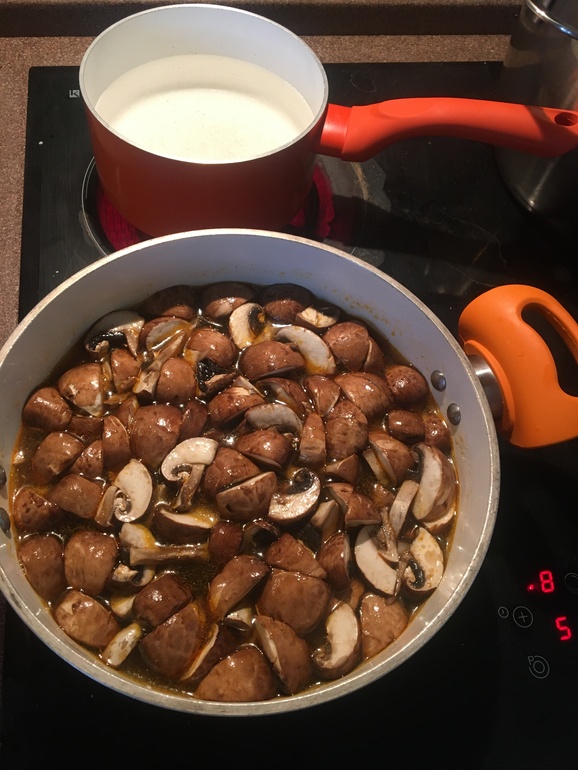 грибам даю покипеть тоже минут 7, затем добавляю порезанную соломкой цедру половинки лайма и сок половинки лайма, а так же кокосовое молоко.