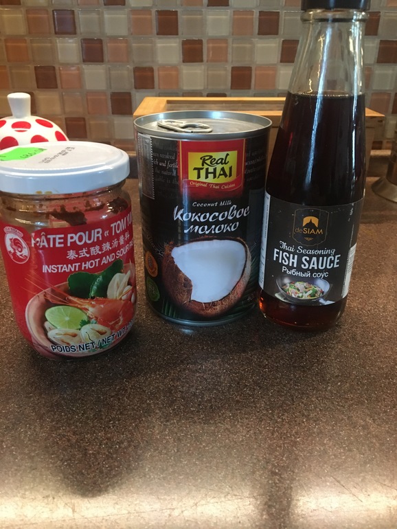 Дальше добавляю в бульон порезанные шампиньоны (режу дольками на 4-8 частей, в зависимости от размера грибов). Даю закипеть и добавляю пасту для том яма 2-4 столовые ложки (добавляю постепенно, всегда пробую) и рыбный соус 1-2 ст.ложки.