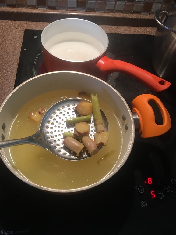 Итак закидываю в куриный бульон (обычно у меня 1,5-2 литра) порезанные корешки имбиря, лемонграсса, стебли лимонника, еще нужны листья каффир-лайма, но мне не встретились за два дня нигде ((