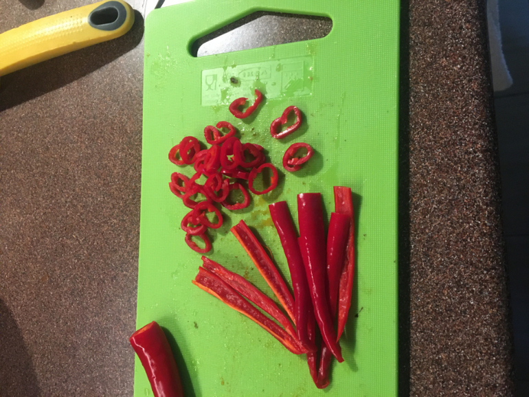 Варю 5-7 минут. Добавляю креветки и перец чили 2-4 стручка (перец частично режу мелко, а частично крупно, что бы выловить перед подачей). Смотрю по остроте перца, в тот раз достаточно было двух, в прошлый положила все 4.