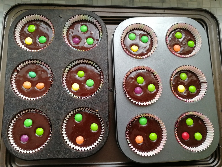 И вот теперь можно поиграть с добавками. Это может быть шоколад растопленный или кусочками, целые конфеты, кокосовая стружка, крошки вафель, орешки и т.п. У нас в этот раз драже (начинки тонут):