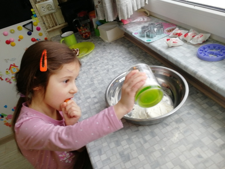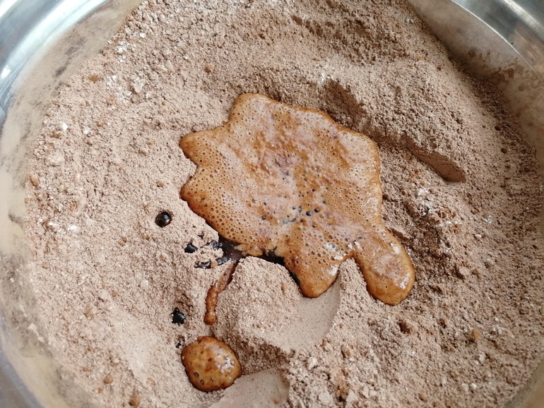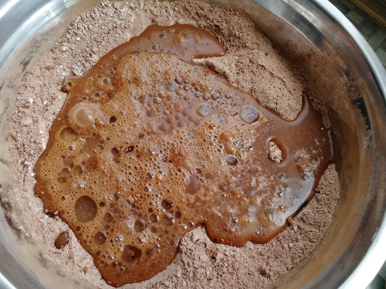 Влить в сухую смесь 5 ст.л. растительного масла без запаха и 1 ст.л. уксуса 9%: