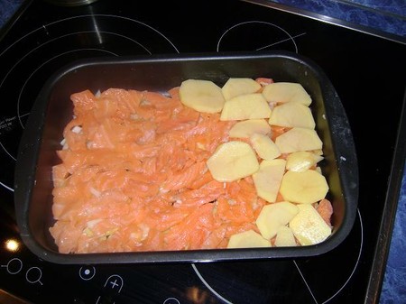 Приготовление: В глубокую посудину для духовки выложить слоями: нарезаный кольцами картофель,подсолить, лук нарезанный (кольцами или полукольцами, кому как нравится), морковка (нарезаная кольцами), сёмга (нарезаная полосками), подсолить.