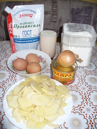 Начинка: 1 банка рыбной консервы в собственном соку или в масле, кому какая нравится (скумбрия, сельдь, сардина, сайра, сардинела и т.п.) 2-3 картошки(почистить и нарезать тоненькими колечками, как на чипсы(я тру на тёрке), 1-2 луковицы мелко порезать.