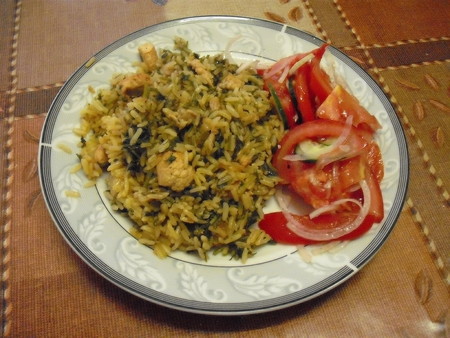 А салат :помидоры,огурцы,лук,соль,перец и немного растительного масла.Получилось вкусно и сытно.