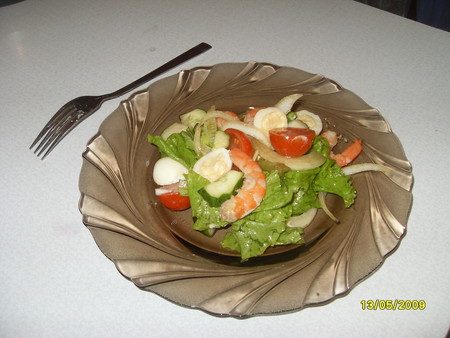 Муж его просто обожает!Ингридиенты:листья салата,помидоры(мы берём черри),огурцы,креветки,перепелиные яйца(по желанию),лук,чеснок(опять же по желанию).