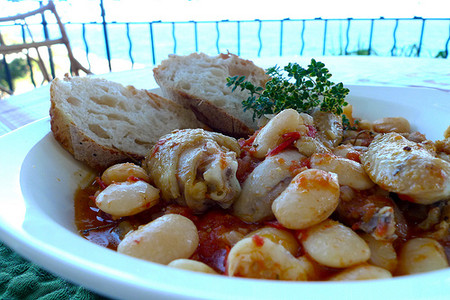 Нужно: курицу около 1 кг, банку консервированной крупной белой фасоли 600 гр, два очень больших помидора (пол кило нормальных), несколько веточек тимьяна, луковицу, 2 зубчика чеснока, оливковое масло, соль, черный перец. Тимьян по желанию, впринципе в оригинале с ним, но я меняю на кинзу, ибо слаба до нее)