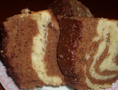 яйца растирают с сахаром добела, добавить сметану, маргарин размягченный, взбивают и всыпают муку смешанную с содой, делят на 2 части в одну из которых добавляют какао, до получения нужного цвета, форму помазать маслом слив.,и поочереди ложкой выложить белое и шоколадное тесто, выпекать минут 40-45 при темп 200-220С, потом можно помазать сверху белым и черным шоколадом, а можно и не мазать