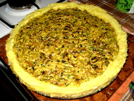 Отложить 3-4 ст.л. пюре, остальное выложить в форму, разровнять. Оставшееся пюре положить в кулинарный шприц (если шприца нет, можно пюре положить в пакетик и отрезать уголок, у меня ни фига не получилось и я дправнивала борта руками).Сделать бортик.В середину выложить грибы, разровнять.