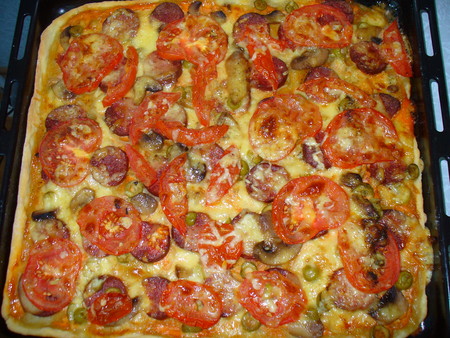Смазать коржи смесью майонеза и кетчупа.Потом положить всё что угодно .Я клала лук,копченую колбасу,оливки,замороженные шампиньоны,помидоры,сыр.