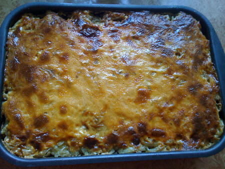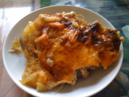 На дно глубокого противеня выложить нарезаную кружочками картошку,сверху кусочки красной рыбки (рыбку я заранее мариную в лимоне,солю и перчу) ,потом предварительно обжареный лук (кто не любит можно без лука и опять слой картошки, сверху смазать майонезом и засыпать тёртым сыром. Приятного аппетита!