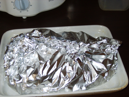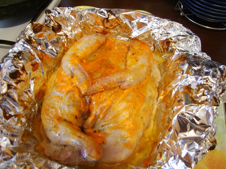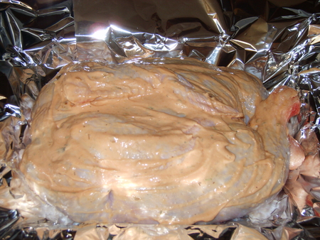 Выкладываем курочку в фольгу и обмазываем смесью майонеза, кетчупа и специй, даем постоять минут 30, чтобы все успело пропитаться.