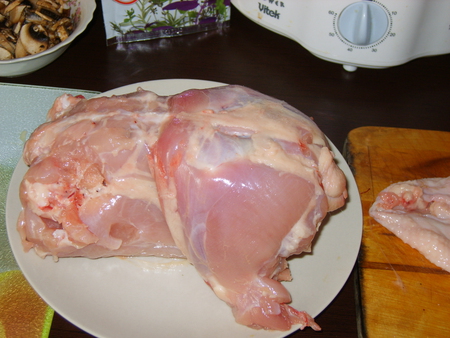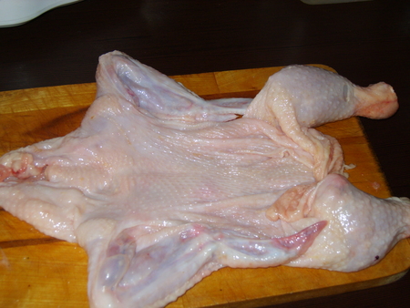 Кожу у курицы остарожно отделяем от костей оставляю косточки только в крылышках и голенях (у меня ушло 10 минут, поскольку под ногами бегал помошник), сразу зашиваем верхнее отверстие и часть нижнего, так чтобы только входила рука.