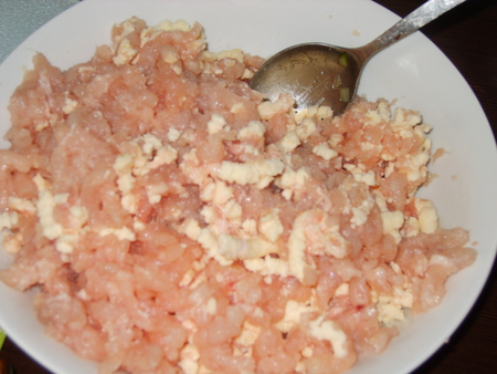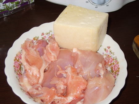 Отделяем куриное филе от костей (кости тут же были отправлены на бульон) и пропускаем через мясорубку через крупные диски для фарша вместе с сыром.