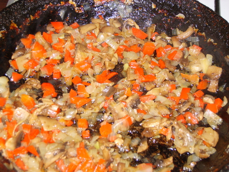 На сковороде обжариваем лук до золотистой корочки, добавляем грибы, тушим минут 10, и болгарский перец, добавляем соль и тушим до готовности.