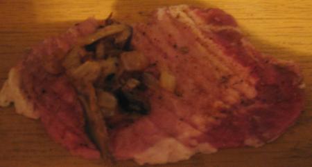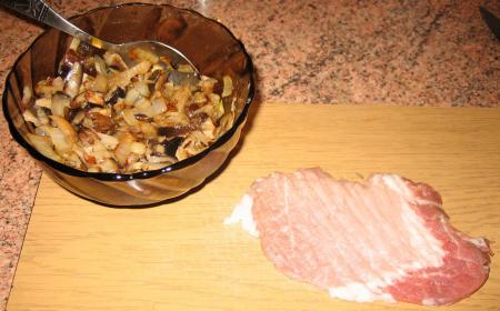 1.Свинину тонко нарезать, посолить и отбить. Грибы нарезать соломкой или еще мельче и обжарить вместе мелко порезанным луком на растительном масле.