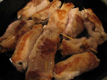 2. На каждый кусочек свинины положить порцию грибов с луком и завернуть рулетиком, закрепить зубочисткой. Обжарить рулетики на раст.масле.