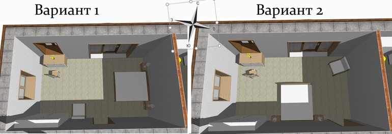 Северная стена (северо-западная) - это балконная дверь с окнами в пол. Я поместила на картинке между вариантами компас.