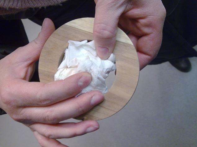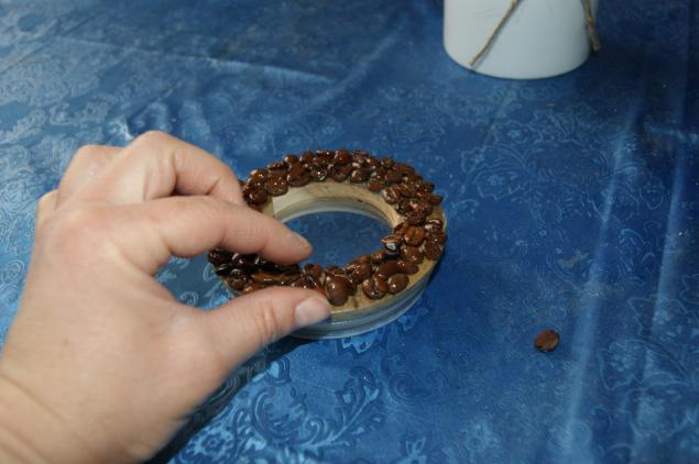 6. Приступаем к декорации крышки. Моя крышка - со стеклянным окошком внутри, поэтому, чтобы не запачкать стекло, кладем в углубление со стеклышком свернутую в шарик салфетку (салфетку слегка намочить, чтобы хорошо и плотно лежала, не топорщилась). Кофейные зерна будут располагаться по кругу крышки, не задевая зону стекла.