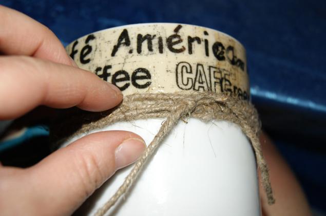 4. По нижнему краю салфетки по окружности баночки наносим клей-момент, примерно 1 см шириной, обматываем в 3 радя веревкой, хорошо придавливаем пальцами, завязываем бантик.