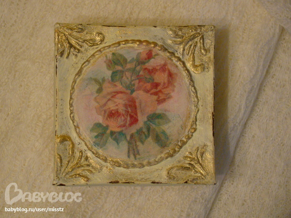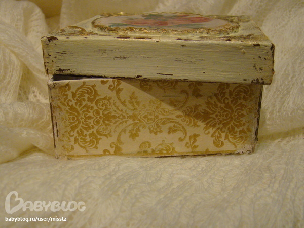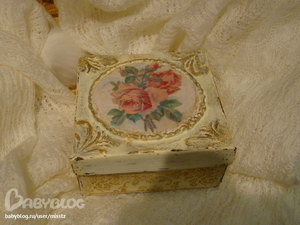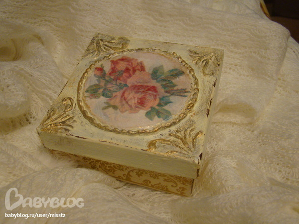 уффф надеюсь ты не против что я практически полность изменила коробочку....нашла наконец розы в нормально формате в общем смотри что получилось))по бокам приклела салфетку, после того как она высохла прошлась шкуркой по углам, и по самой салфетки, что бы она выгледила потертой.На крышку вокруг выпуклой части , при помощи шприца и шпклевки сделала рельеф, когда все высохло покрасила в темный цвет, натерла свечой, приклеила мотив(в этот раз я стала умнее и покрыла его сразу лаком матовым)затем по всем рельефам которые я изобразила, губкой слегка нанесла коричневую краску, а с верху покрыла золотой.Пока все. Тени на розах нужны??я сейчас их не стала даже пробовать делать, лучше при дневном свете. ну вот что получилось.Слушаю замечания.