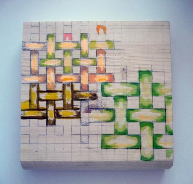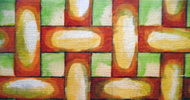 - Если заготовленного орнамента, на ваш взгляд, недостаточно для декорирования данного предмета, можно использовать собственные художественные навыки. В моем случае, это понадобилось для создания эффекта объемности. Орнамент из декупажной карты казался черезчур плоским. Поэтому на помощь пришел незамысловатый навык рисования сетки в виде плетеных полос. Для этого понадобилось разлиновать доску на квадраты 1,5см*1,5см. Обратите внимание, что карандаш с трудом стирается с окрашенной поверхности, поэтому разлиновывать лучше без нажима. Затем окрасить каждый прямоугольник по принципу: темнее и ярче по краям, светлее – к центру. Используйте несколько оттенков краски: средний цвет ( в данном случае оранжевый) по краям прямоугольника; темно-оранжевый ( с примесью коричневого) в уголках прямоугольника; светло-желтый по центру; белый –штрих по центру со сдвигом в сторону. Таким образом визуально будет эффект объемности и «живости» сетки.В качестве пробника я использовала оставшуюся часть доски.