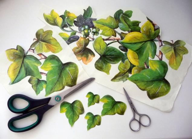 - Далее момент творческий. Главная задача на данном этапе выбрать орнамент и расцветку будущего шедевра. В качестве орнамента декупажа можно использовать салфетки или декупажные карты, которые продаются в специализированных лавках для творчества и хобби. Работа с салфетками требует определенных навыков, так как материал очень тонкий, легко рвется и с трудом удается выровнять салфетку на влажной поверхности без заметных заломов. Лично я предпочитаю декупажные карты за их высокую прочность по сравнению с салфетками и возможность вырезать орнамент, в отличие от салфеток, которые желательно вырывать. Вырежьте из декупажной карты (или вырвите из салфетки) выбранные элементы. Тщательно удалите ненужные элементы из орнамента, включая мелкие фоновые кусочки.
