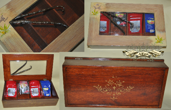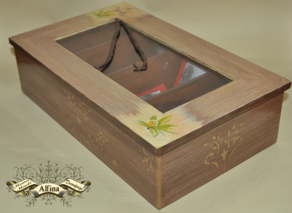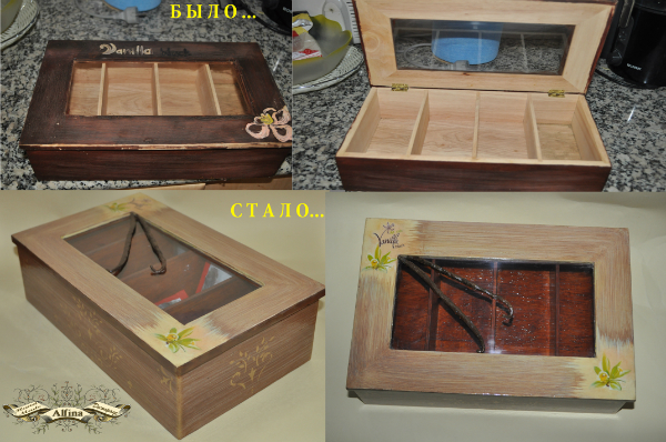 Материалы: деревянная коробка, морилка по дереву, трафарет, распечатка, акриловые краски, акриловый лак, стручки ванили.