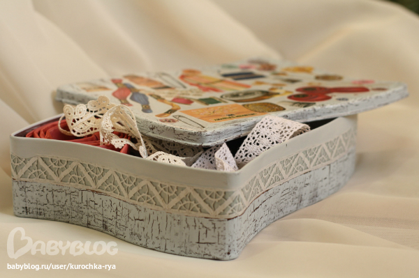 Приклеила на крышку снаружи и внутри мотивы декупажной карты, на низ приклеила мотив в виде кружева