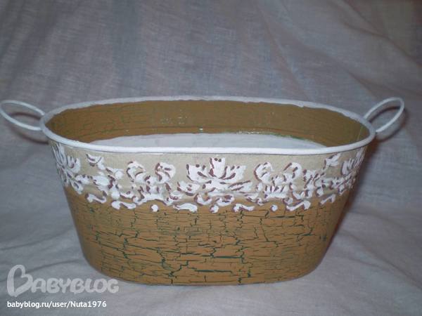 Архив работ к урокамВыставляю на ваш суд свой тазик, скажу честно, сама не двольна, предполагаю, что надо просить отсрочку по этому уроку. Старалась как могла, сам кракелюр мне нравится, а вот общий вид тазика.............. замедлителя для краски не было, роспись не получилась...