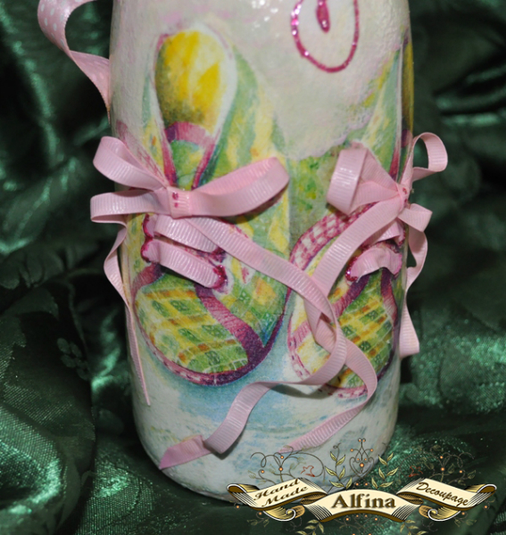 Материалы: Буиылка, заготовка фоторамки деревянная, бант из гипсовой массы (заготовка), ленты, салфетка, рисовая карта, акриловые краски, акриловый лак, контуры.