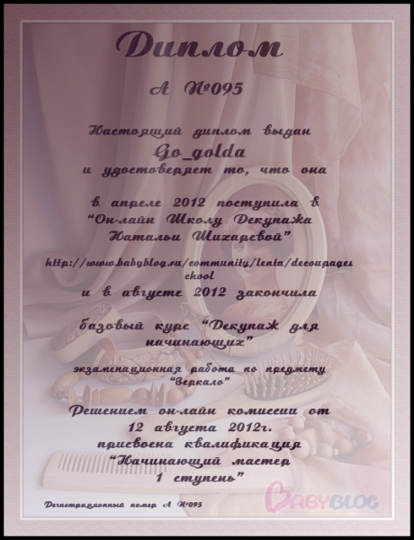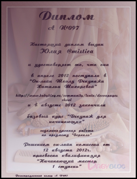 Ура! Как я счастлива, дождалась! Наташа и любимые модераторы, спасибо Вам огромное! Теперь в рамочку и на стенку! Да и в дневнике до сих пор нет моих художеств, ждала диплом.
