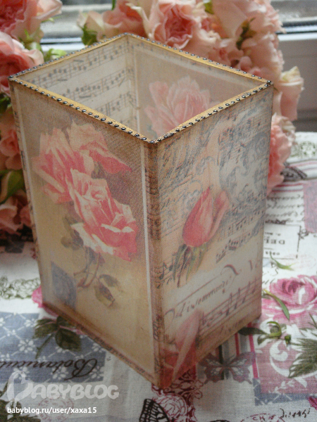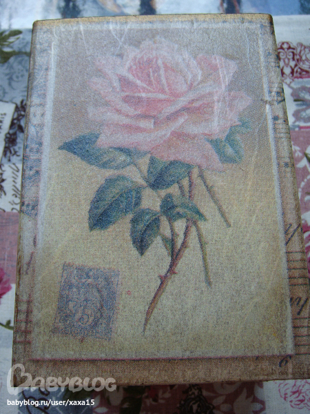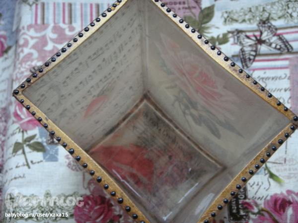 Наклеила бумагу рис с мотивами (стыки подбирала, их практически не видно! рисунок плавно переходит один в другой), высушила. Чуть состарила края и ребра патиной, контуром черного цвета выделила верхний край, все покрыла 3мя слоями лака!