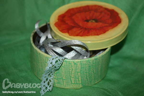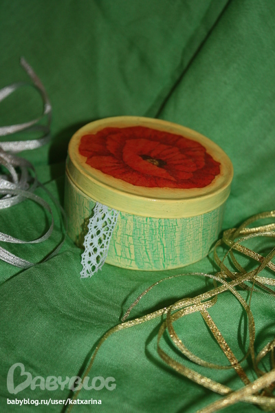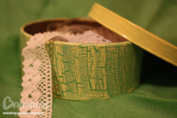Ход работы: загрунтовала коробочку, после покрыла зеленой краской, далее после высыхания нанесла кракелюрый лак, выждала положеное время и нанесла краску желтого цвета, далее дала высохнуть и покрыла лаком, после высыхания лака на крышку методом "файла", нанесла салфеточнй матив и покрыл крышку лаком, после высыхания лака пастелью сделала небольшую тень, покрыла лаком в два слоя. Ну как то так.