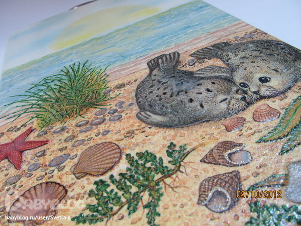 - Дорисовала там где салфетка немного порвалась и волны, нарисовала небо, солнце, отражение в море;